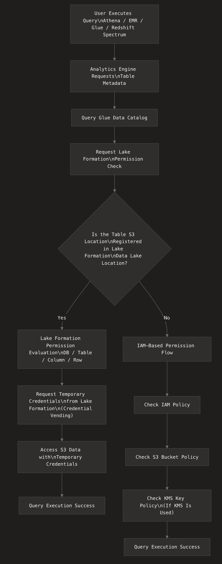 Lake Formation assumes the IAM role specified during registration and issues temporary credentials (credential vending) to integrated services (Athena/EMR/Glue, etc.)
