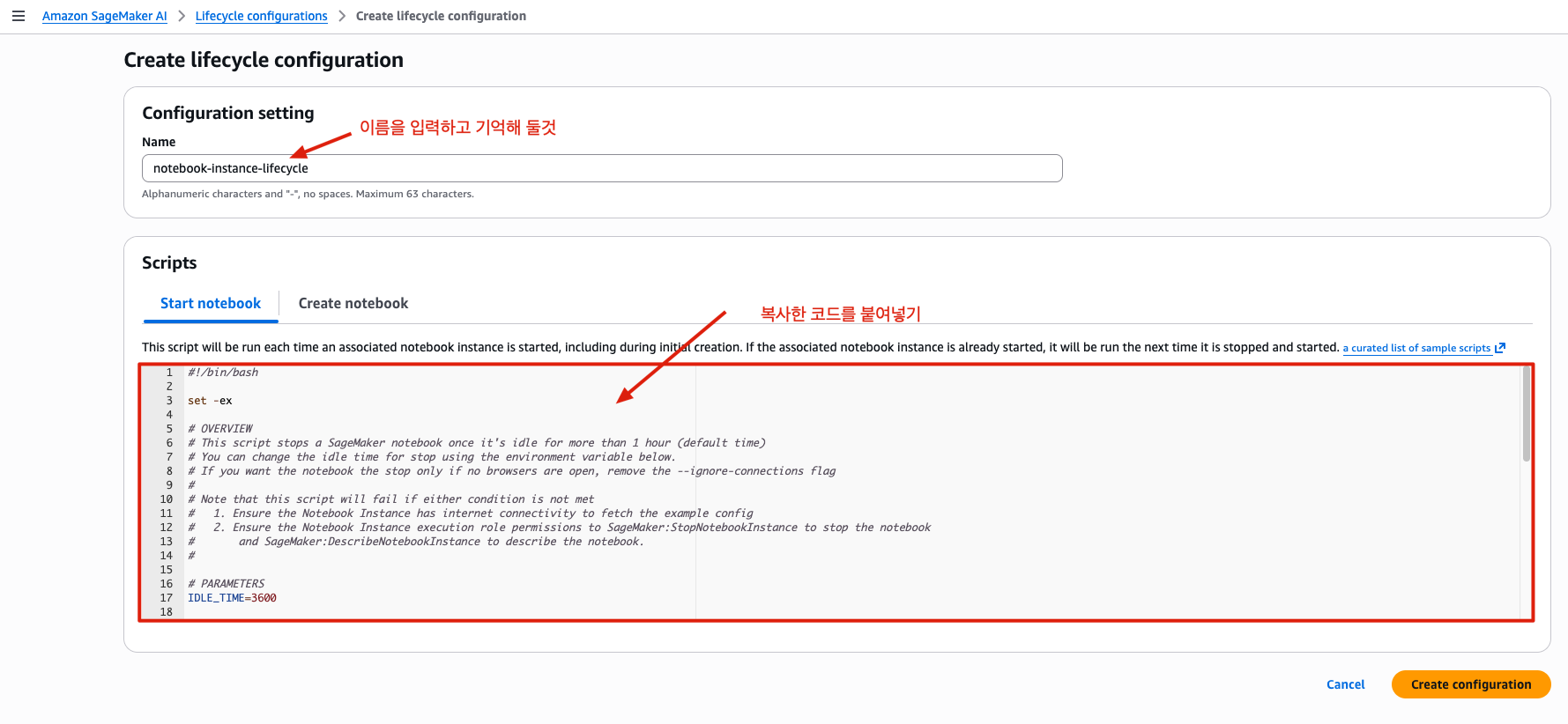 - Sagemaker lifecycle configurations에서 생성한 리소스의 이름을 코드 내에 입력