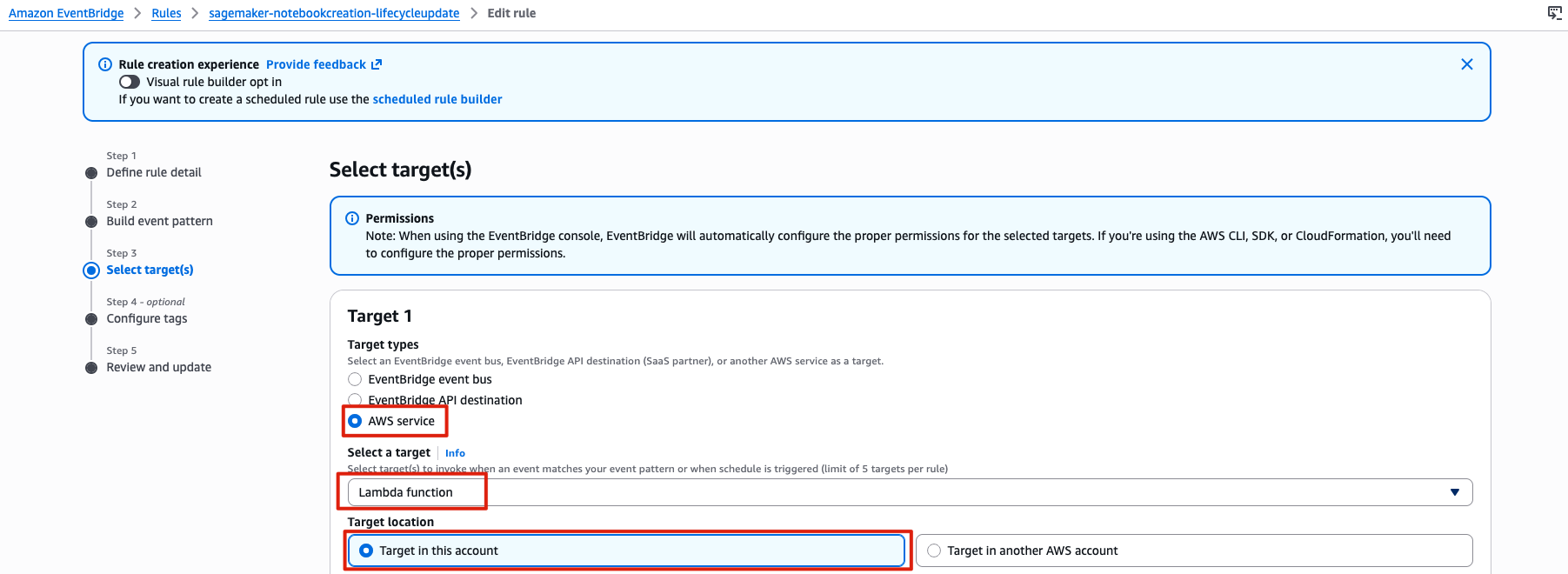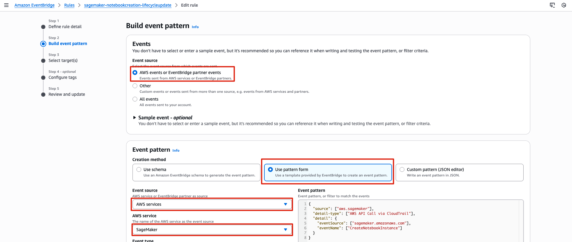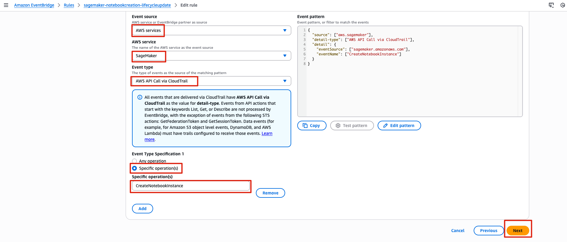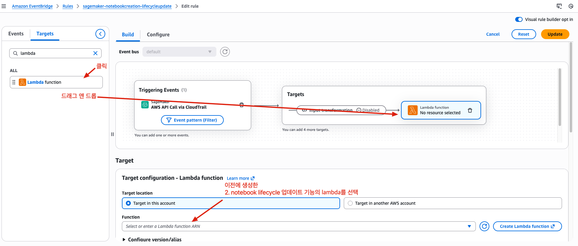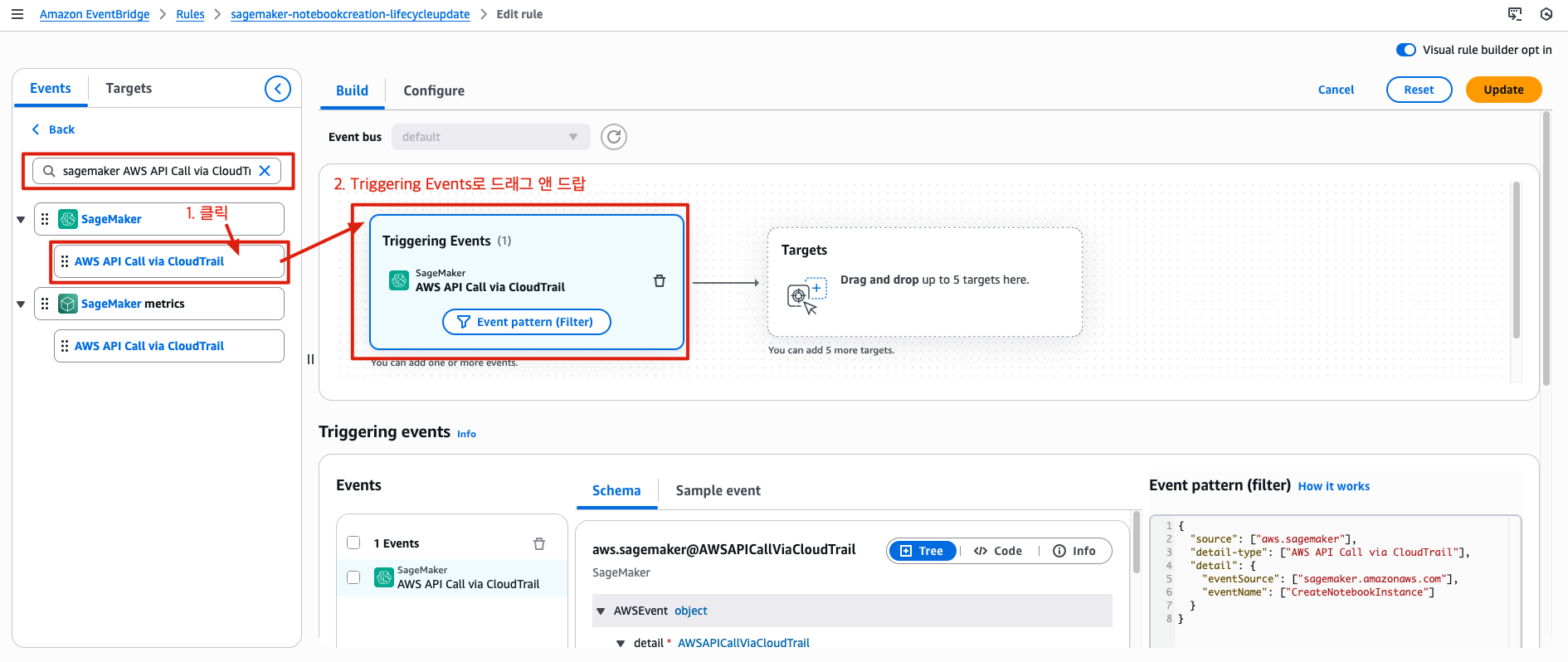 CreateNotebookInstance이벤트 패턴Targets: (이벤트 감지 시 정보를 받게 되는 대상)